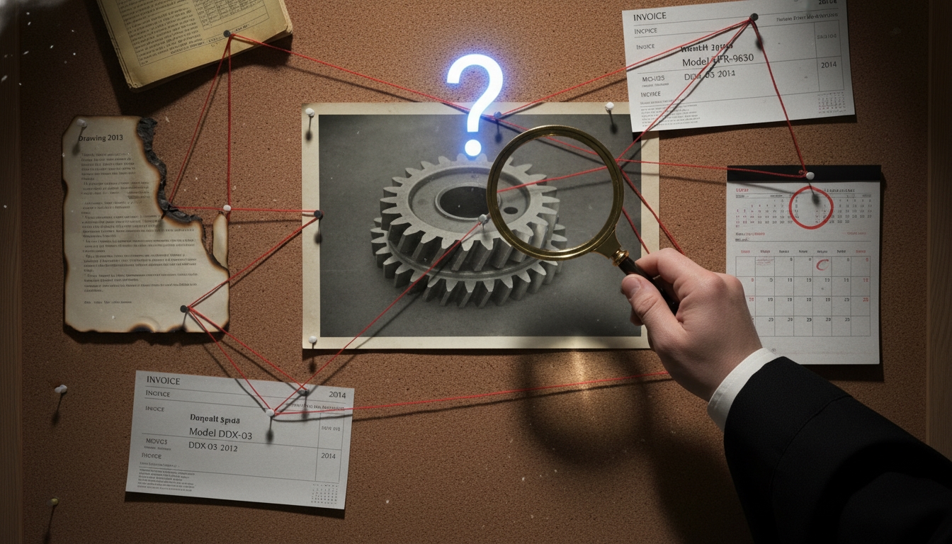 A top-down view of a detective's evidence board. In the center, a large photograph of a complex machine gear (representing the trade secret). Surrounding it are various pieces of evidence: a torn and burnt document labeled "Drawing 2013", an invoice labeled "Model DDX-03 2013", another invoice labeled "Model KPR-9630 2014", and a calendar with a red circle on "Feb 2014". Red strings connect these items, but a magnifying glass held by a judge's hand reveals a critical flaw: a string showing the "Drawing 2013" is connected to an earlier "Instruction Manual 2012", with a large glowing question mark over the connection, indicating a logical paradox. The overall style is realistic, detailed, with a dramatic, shadowy film-noir lighting. The mood is one of intense scrutiny and discovery. --ar 16:9 --style raw`