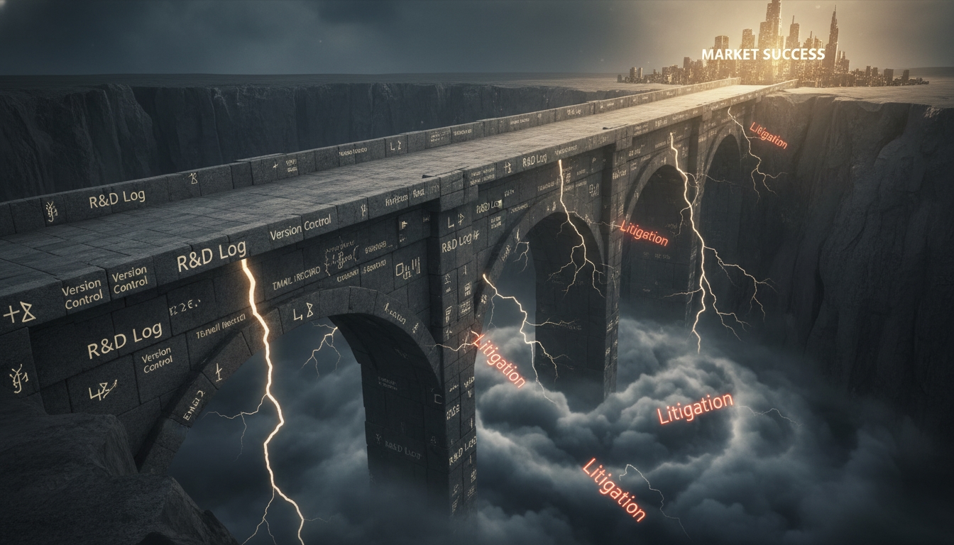 A metaphorical image showing a solid bridge built from interlocking stone blocks, each block engraved with symbols like "R&D Log", "Timestamp", "Version Control", "Email Record". The bridge spans a chasm, safely leading to a shining city labeled "Market Success". In the chasm below, a fierce storm with lightning bolts labeled "Litigation" rages, but the bridge remains unshaken. The style is epic, cinematic, and slightly stylized, with dramatic lighting highlighting the strength and integrity of the bridge. --ar 16:9 --style raw`